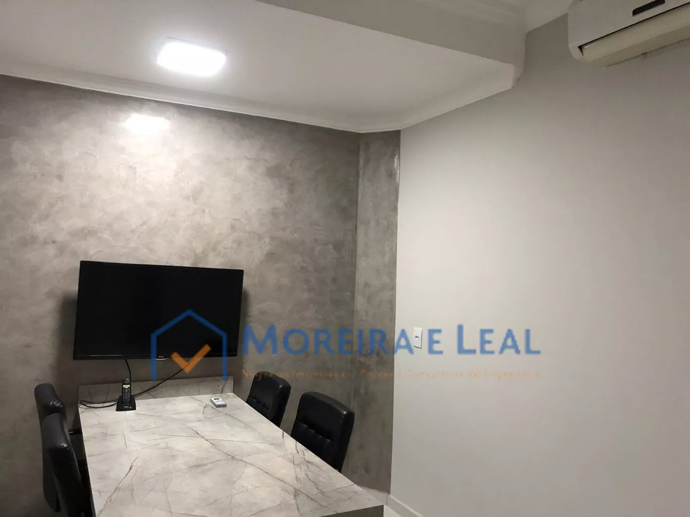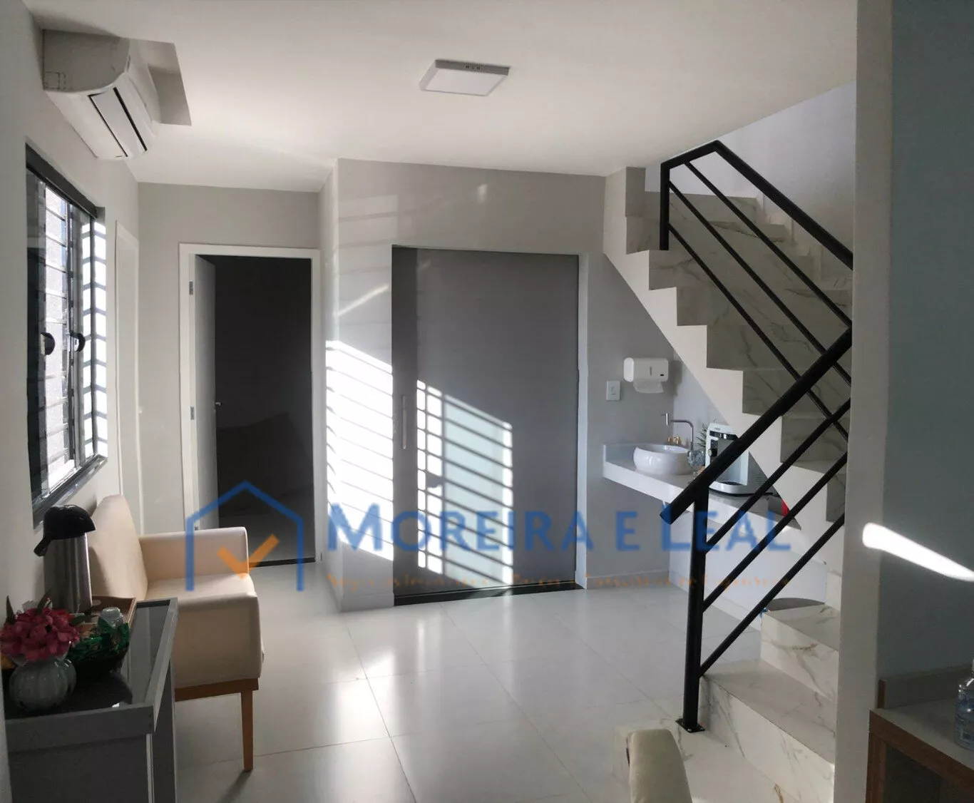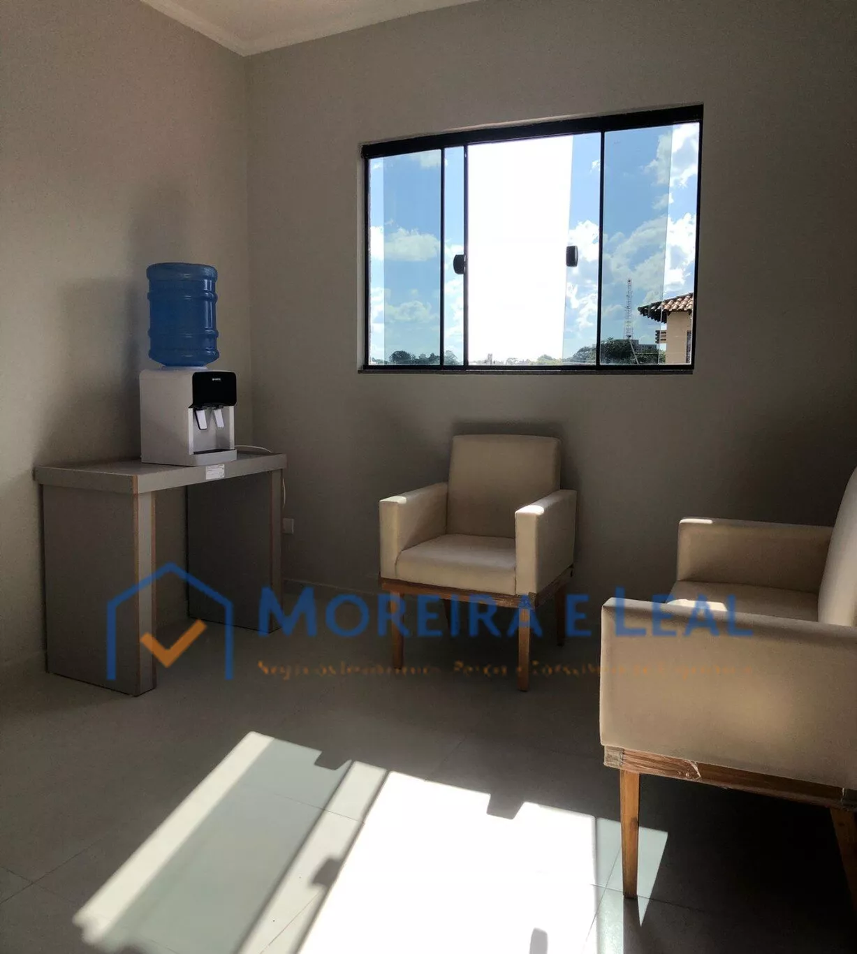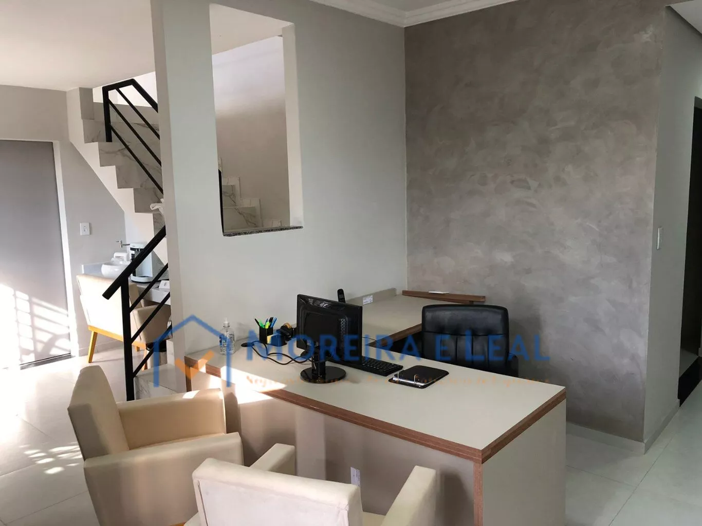 Recepção, sala de espera no andar superior, sistema de monitoramento , sala de reunião, copa, banheiro.