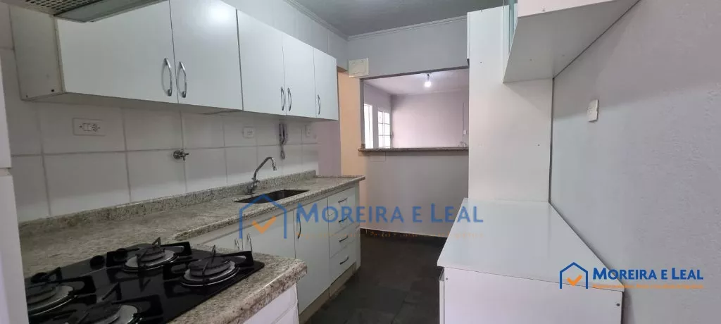 Cozinha com armários planejados, balcão todo em mármore, fogão coocktop e depurador já instalados